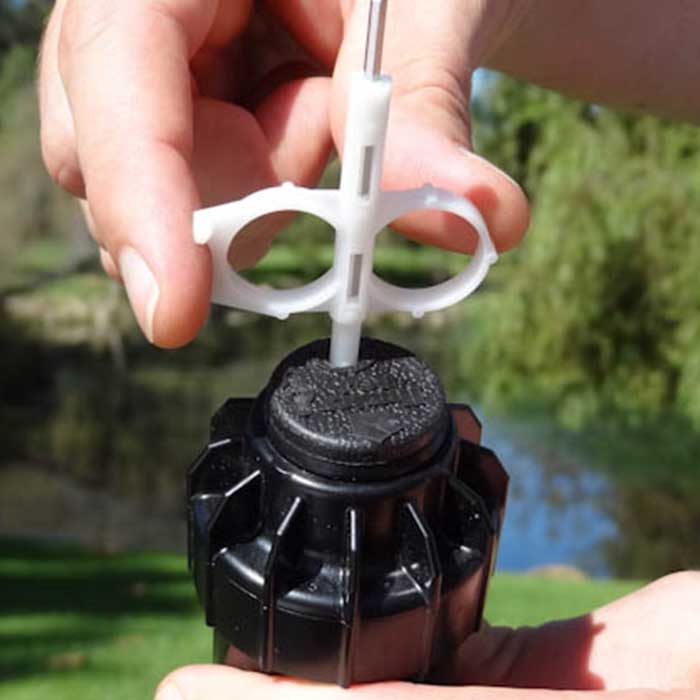 ۱-ابتدا انتهای پلاستیکی کلید هانتر (آچار مخصوص تنظیم آبپاش هانتر) را در داخل حفره تنظیم در قسمت بالای آبپاش قرار دهید.