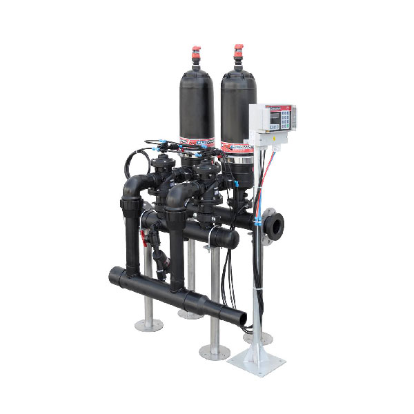 پکیج فیلتراسیون 2 اینچ 2 واحدی با کلکتور فلزی ورسک تعدادی ار فیتلر که کنار هم قرار گرفته به صورت خودکار آب با مایعی را تصفیه می کند.